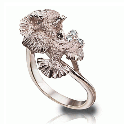 Кольцо "Голуби" с 3-мя бриллиантами, выполнено из белого золота 585 пробы, средний вес изделия 7,16г. Вставка 3 бриллианта Круглой огранки с 57-ю гранями, с характеристиками не ниже 4/6, общим весом ~ 0,079кт. Габаритные размеры скульптурной композиции 19 х 17 мм. Кольцо отполировано до зеркального блеска.