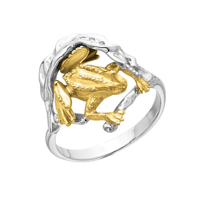 Кольцо "Лягушка" с 5 бриллиантами, выполнено из желтого и белого золота 585 пробы, средний вес изделия 6 г.