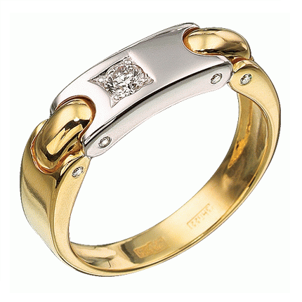 Мужской перстень "Денди" с 9-ю бриллиантами, выполнено из желтого и белого золота 585 пробы, средний вес изделия 7,16г. Вставка 1 бриллиант Круглой огранки с 57-ю гранями, с характеристиками не ниже 4/6, весом ~ 0,164кт и 8 бриллиантов Круглой огранки с 57-ю гранями, общим весом ~ 0,065кт. Кольцо отполировано до зеркального блеска.